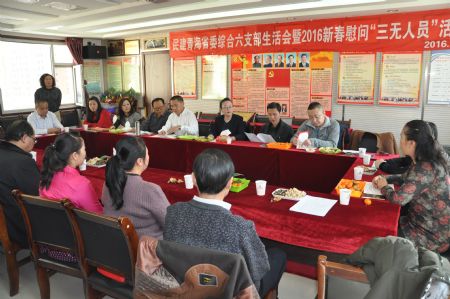 周成金首先向与会同志传达了民建青海省委六届五次全委(扩大)会议精神,向民建青海省委副主委王建民一行汇报了综合六支部一年来支部政治学习、积极参政履职、开展社会服务活动的情况。周成金说,在民建青海省委的领导下,在支部会员的共同努力下,支部各项工作取得了长足的进展,在2015年支部被民建中央评选为全国优秀基层组织。在猴年新春即将来临之际,社区困难群众的生活牵动着支部会员的心,经过支部会议表决,大家积极捐款,一致同意将支部会员捐助的会费用来帮助社区困难群众,帮助他们过一个快乐祥和的春节;西宁市城中区解放路社区书记徐贤琴代表社区向民建青海省委及民建综合六支部表示感谢。随后她向大家介绍了困难群众的情况,这些困难群众主要是烈军属、残疾人、病属和失独家庭,长期生活困难。民建青海省委综合六支部在春节来临之际向这些困难家庭分别给予1000元的慰问金,这将改善他们的生活,帮助他们度过一个温暖的春节,也将对社区内的“三无”困难群众产生激励作用,让他们重新树立起对生活的信心和希望。