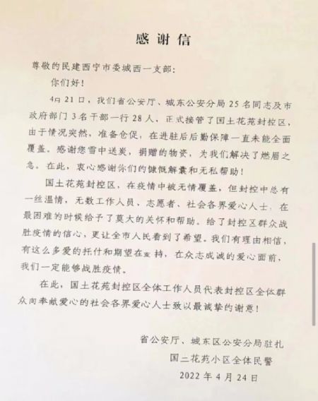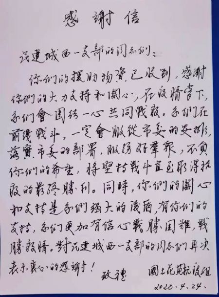 22日24时,西宁市城西区、城北区及城中区解除静态管理,但为了赢取全面胜利,很多医护人员、社区工作者和志愿者仍驻扎在静态管理的东区拼搏奋战。解封后,支部支委第一时间联系到城东区疫情形势最为严峻的封控小区之一——西宁国土花苑小区抗疫小组的主要负责人,了解到他们目前工作生活部分所需物资短缺。支部支委紧急在会员群内发布“捐款倡议书”,短短几个小时募得捐款3500元。23日下午17时,支部将采购的头戴式N95口罩、消毒湿巾及牛奶等价值7000元的物资送到民和路封控点,并联系疫情指挥部转送到国土花苑小区。伴随物资前往的还有一封满寄关怀和崇敬之心的《给志愿者的一封信》,信中这样写到“你们是新时代最可爱、最值得敬佩的人!从来没有什么岁月静好,只有你们这些志愿者在负重前行;从来没有从天而降的英雄,只有挺身而出的普通人......你们不惧风险、迎难而上的奉献精神,让我们对抗‘疫’信心倍增”。24日,国土花苑抗疫小组主要负责人和25位驻扎在国土花苑小区的民警同志们在百忙之中抽空回信致谢。