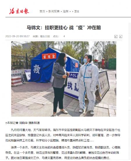 每当夜深人静,同事们开始轮换着休息的时候,马锦文办公室的灯却总是亮着,她埋头整理总结头一天的工作,安排规划着第二天的任务。“相比深入高风险区抗疫的工作人员,我这些工作实在微不足道,但能够为疫情防控工作尽绵薄之力,我心里很欣慰。希望通过我们大家的努力,能够尽可能地帮助大家在特殊时期安心工作,共同为早日取得疫情防控的最终胜利而努力。”马锦文在向记者介绍自己的工作内容时,语气沉稳而又坚定。