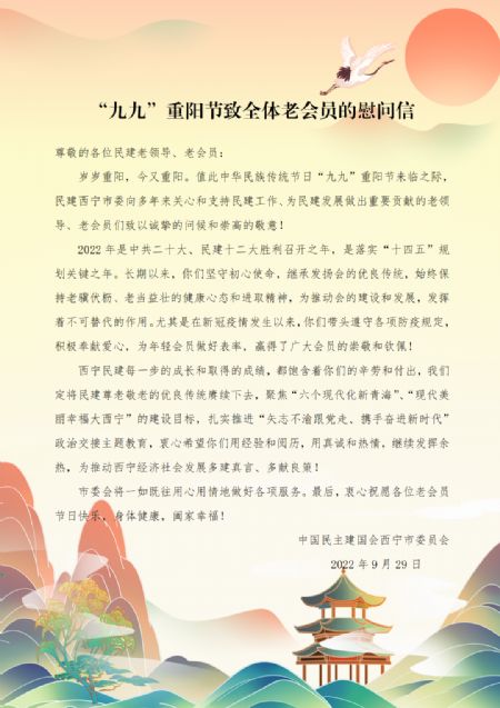 在举国欢庆国庆和传统节日重阳节来临之际,民建西宁市委以电子慰问信的形式,向多年来关心和支持民建工作、为民建发展做出重要贡献的老领导、老会员们致以崇高的敬意和节日的问候!