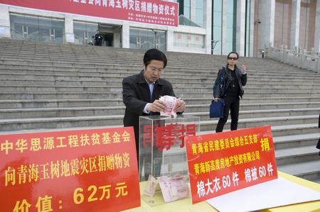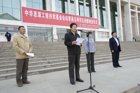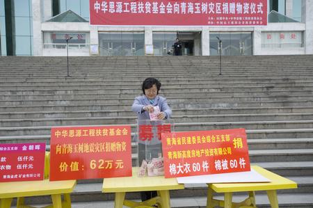 在捐赠仪式上,民建中央、中华思源工程扶贫基金会向玉树捐赠价值62万元的救灾物资,为灾区送去了矿泉水、方便面、发电机和救急药品。此次活动共捐赠人民币13.79万元,价值124万元的救灾物资。