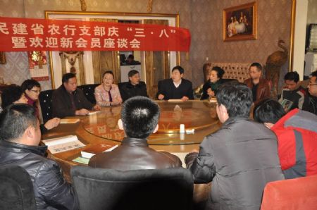 2012年2月26日,民建青海省委直属农行支部在城南新区召开庆“三·八”暨欢迎新会员座谈会。民建青海省委副主委黄梓平、王建民,民建青海省委组织部部长李小燕、调研部部长卢军及农行支部会员20余人参加了座谈。