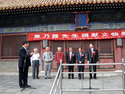 “章乃器先生捐献文物展”是故宫博物院为纪念章先生诞辰一百一十周年所举办的活动。此次展示的九十多件文物,是从章乃器先生捐献的文物中精选出的。章乃器先生在公务之余,以自己的资金和积蓄广泛搜集流失在社会上的文物,并将其中的精华分两次捐献给国家,总计约二千余件。