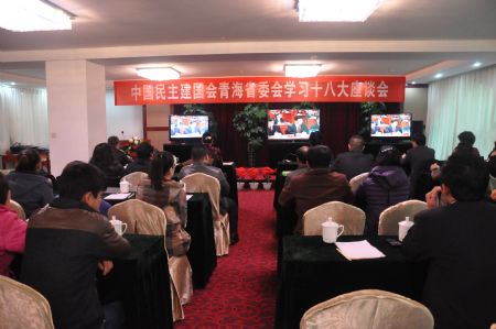 2012年11月8日上午9时整,中国共产党第十八次全国代表大会在北京人民大会堂隆重开幕。民建青海省委组织部分会员代表及省委会机关干部,50余人在西宁市东湖宾馆四楼会议室集体收看开幕式盛况。青海省人民政府副省长、民建青海省委主委高云龙也在现场认真聆听了胡锦涛总书记所作的工作报告。整个过程中大家精神集中,认真观看,仔细记录,现场气氛凝重庄严。